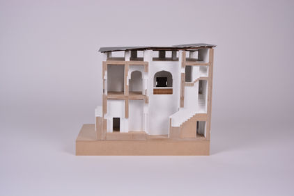 The house is built from coral ragstone set in thick lime mortar, the ceilings constructed from mangrove wood beams. The three-storey high, approx. 70cm thick walls keep the inside cool. The roof is made of corrugated metal sheeting giving shade to the open storey beneath. The entrance façade is orientated towards a narrow street and incorporates a traditional Arabic timber door and Barazas (seating) stretching along the length of the building. The entrance level is approximately 3 steps higher and often leads the visitor directly into the courtyard. In this case the access to the courtyard is not direct and incorporates waiting spaces before finally reaching the courtyard. The windows are relatively small, keeping the house private and closed to the sun. The courtyard offers an outside space for the house dwellers and provides natural lighting and ventilation for the inside of the house. There is an open corridor running around 3 sides of the courtyard leading into the private rooms. The first floor follows the pattern of the ground floor with a gallery overlooking the courtyard and a mixture of long and small rooms leading from it. On one side there is the (only) staircase to the upper level and the attic. The over five metre floor to ceiling heights are high in comparison to the width of the rooms. This typology is an important reoccurring building in the urban heritage of Stone Town. Whilst scattered within the historic centre of Stone Town, the typology tends to be located in the most prominent places within the city - an architectural testament to one of the main cultural influences in Zanzibar.