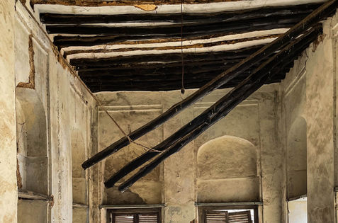 Due to a lack of maintenance over the past years, rusty or missing roofing allows water to infiltrate the walls. The ends of the mangrove beams (boriti) rot and can no longer support the ceiling. Once the ceiling fails, the walls are no longer stiffened and collapse.